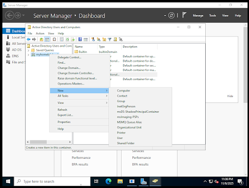 In Active Directory Users and Computers, I right-clicked my domain and selected New > Organizational Unit. You can access Active Directory Users and Computers through Tools at the top right of Server Manager.