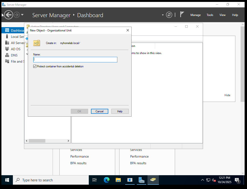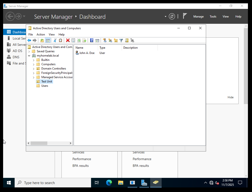 For this lab, I’m keeping things straightforward. I’m creating a few Organizational Units, placing new users inside those units, and setting up a Group Policy to show how settings can be applied at the OU level. This builds on my last lab and walks through the first steps of organizing a domain and managing users or computers through Group Policy.