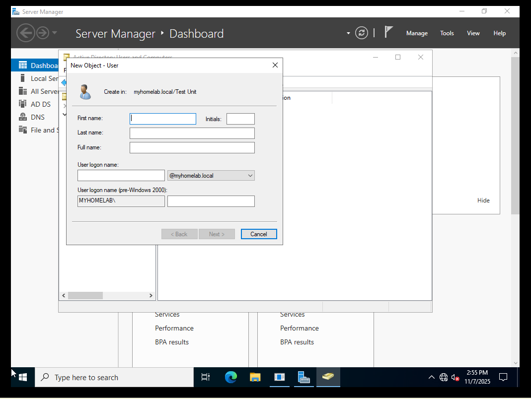 I went ahead and added a user by right-clicking the OU and selecting New > User. That opens the wizard for creating a new user. From there, just fill in the user’s details, set the initial password, and decide whether you want to let the user change it or not.