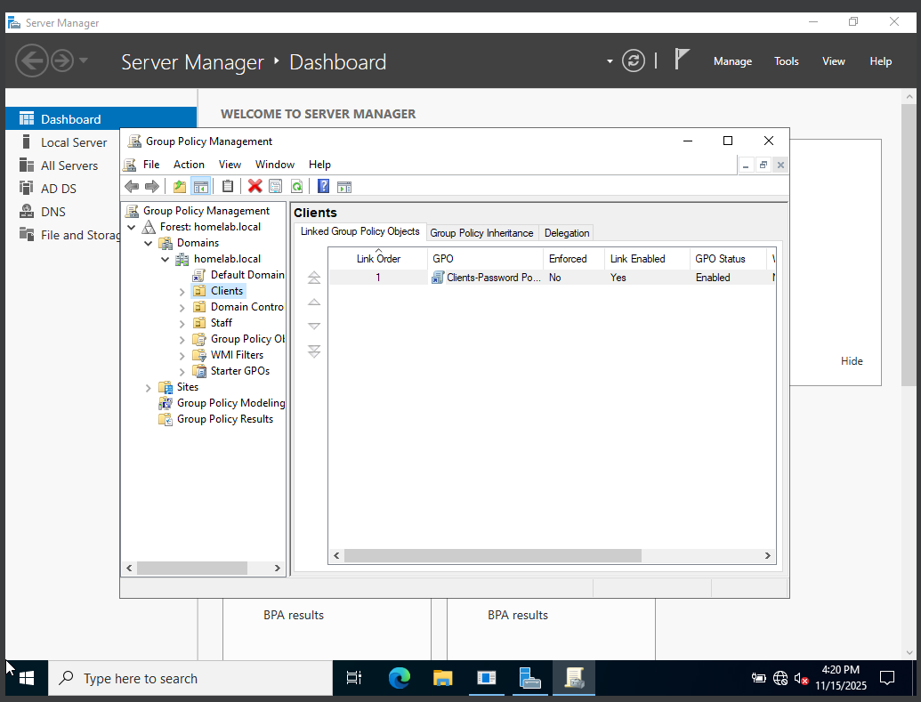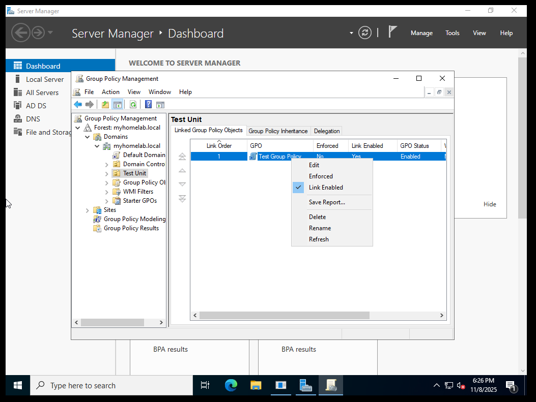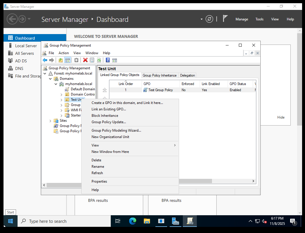 In this lab, I set up a basic Active Directory structure using OUs and GPOs. I built a clean layout where users were placed inside the correct OUs and walked through where the policy settings are located so they can be assigned to the right groups. This kind of structure keeps the environment organized and creates a solid foundation for future labs.