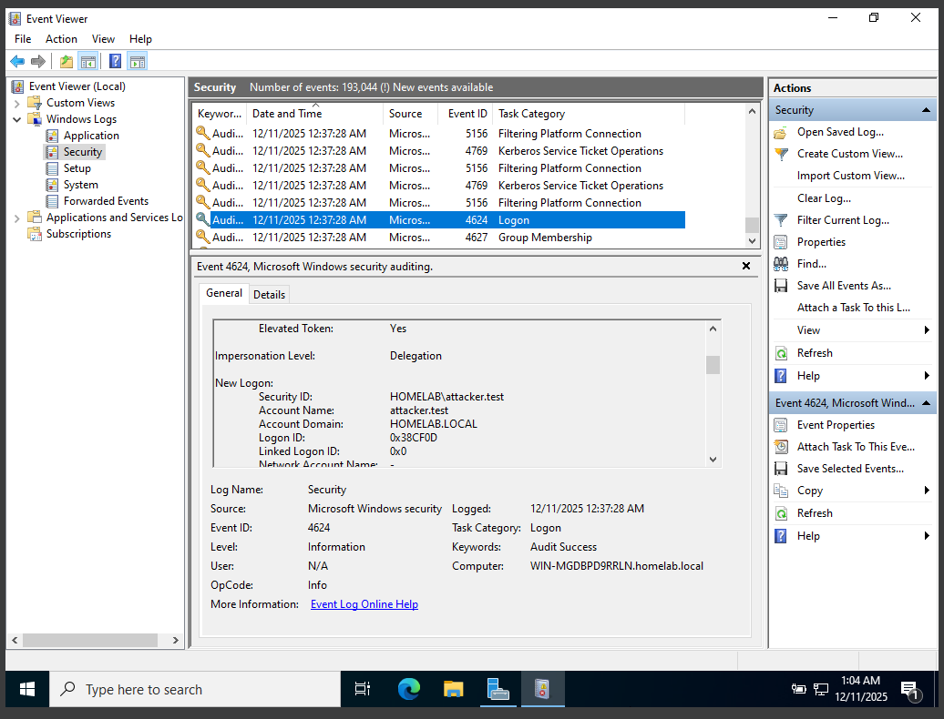 Event ID 4634 was observed shortly after authentication, indicating that the remote session was terminated. The short-lived session supports the conclusion that while authentication succeeded, the lack of authorization prevented sustained access or command execution. Overall, the evidence reflects a partial lateral movement attempt where identity was validated, but privileges were insufficient to continue activity.