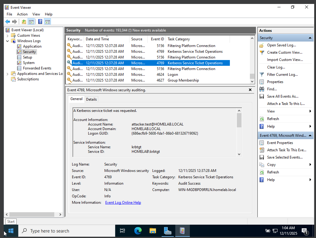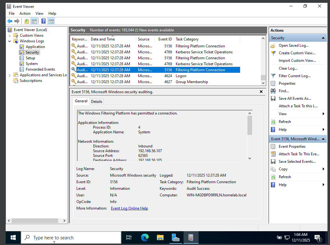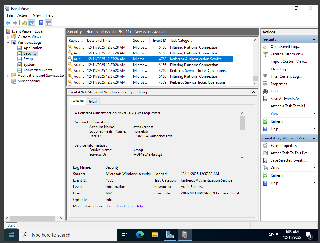 Event ID 5156 confirms that the inbound network connection was permitted through the firewall, establishing that the authentication attempt reached the domain controller. Event ID 4768 records the Ticket Granting Ticket (TGT) request associated with this authentication, followed by Event ID 4769, which indicates a Kerberos service ticket request for access to domain services. Together, these events confirm that Kerberos authentication proceeded normally despite insufficient privileges for execution.